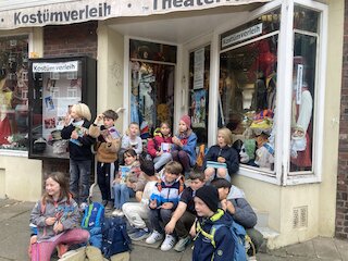 Wir - Elina, Finn, Erik, Jonas, Pit, Maxi, Leni, Finja, Emilia, Elias, Karim, Kansa, Olivia und Nils - besuchten für unsere Halloweengeschichte den Kostümverleih Hamburg. Frau Leverenz, die Besitzerin, erzählte uns jede Menge interessante Sachen. So erfuhren wir, dass die meisten Kostüme zu Halloween ausgeliehen werden. Und welche Rolle ein Stein in ihrem Laden spielt und warum auch noch tanzende Monster auftauchen, erfahrt ihr hier. Für unsere gruselige Halloween Choreografie erhielten wir tatkräftige Unterstützung von der Tanzpädagogin Moana Kalettka von dem Tanzclub Salatio. Das war alles ein riesiger Spaß!